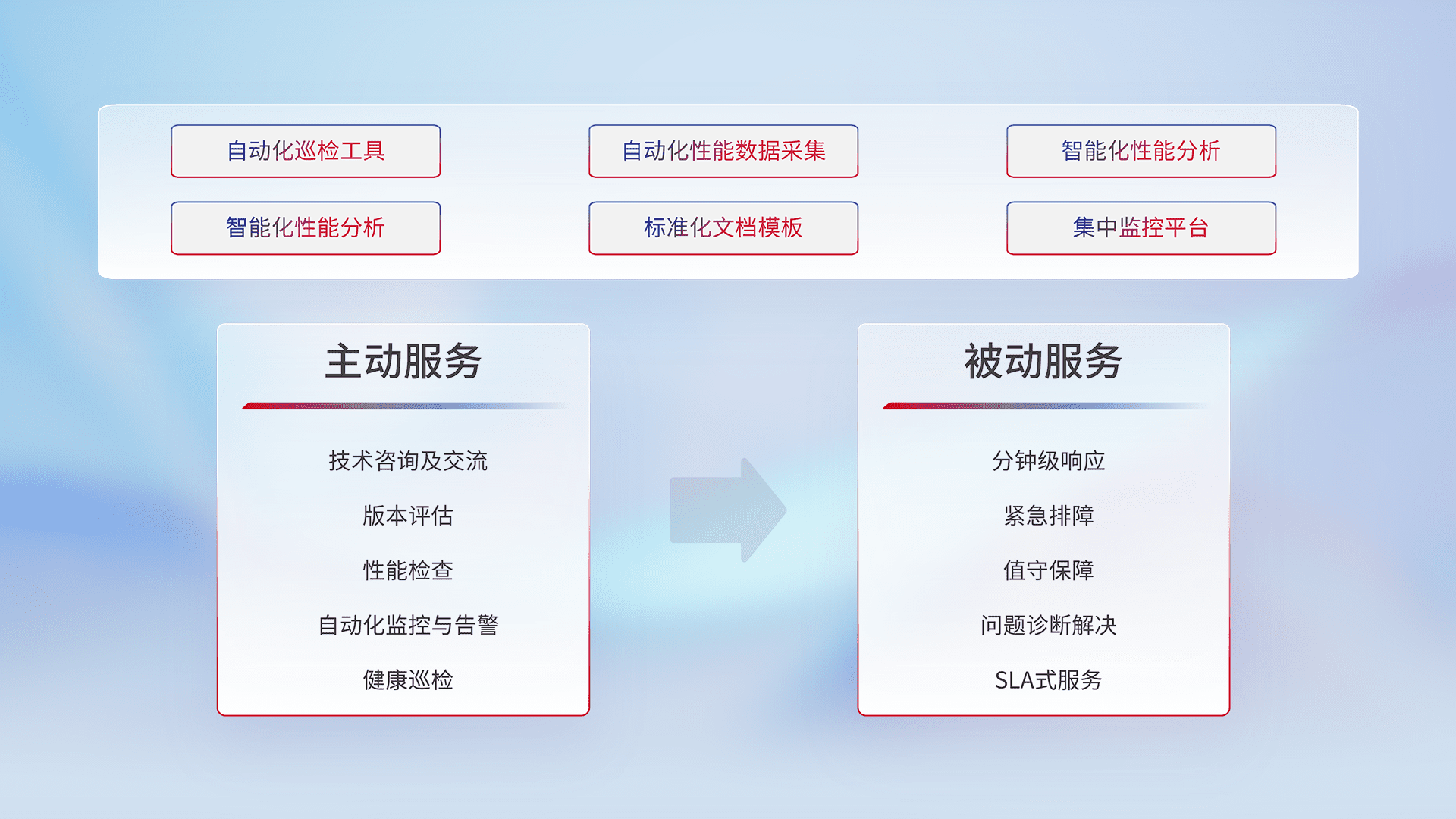 智能化工具和标准化文档,,,保障服务质量,,,提供主动服务(包含技术咨询、、、版本评估、、性能检查、、、自动化监控与告警、、健康巡检)和被动服务包含(分钟级响应、、、、紧急排障、、值守保障、、问题诊断解决、、、SLA服务)。。